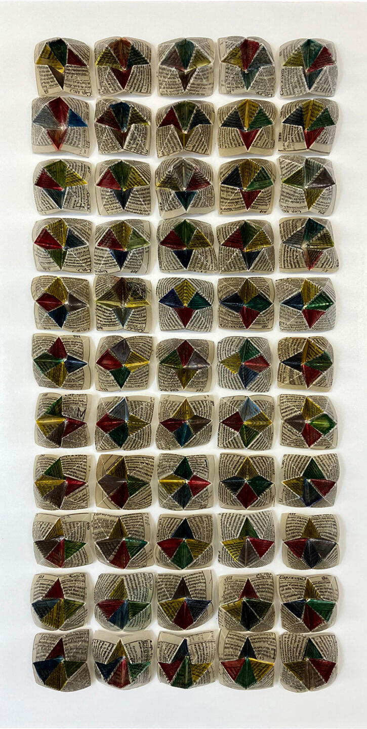 Her works are usually made as reliefs in papyrus and paraffin on wood. Depending on the motif, dried flowers or other materials are also incorporated in her works.